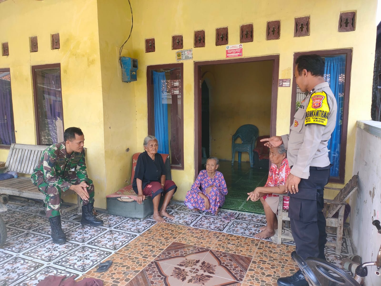 Dalam kunjungan tersebut, petugas tampak berbaur dengan warga, termasuk berbincang santai dengan para lansia di teras rumah hingga diskusi hangat di dalam ruangan.