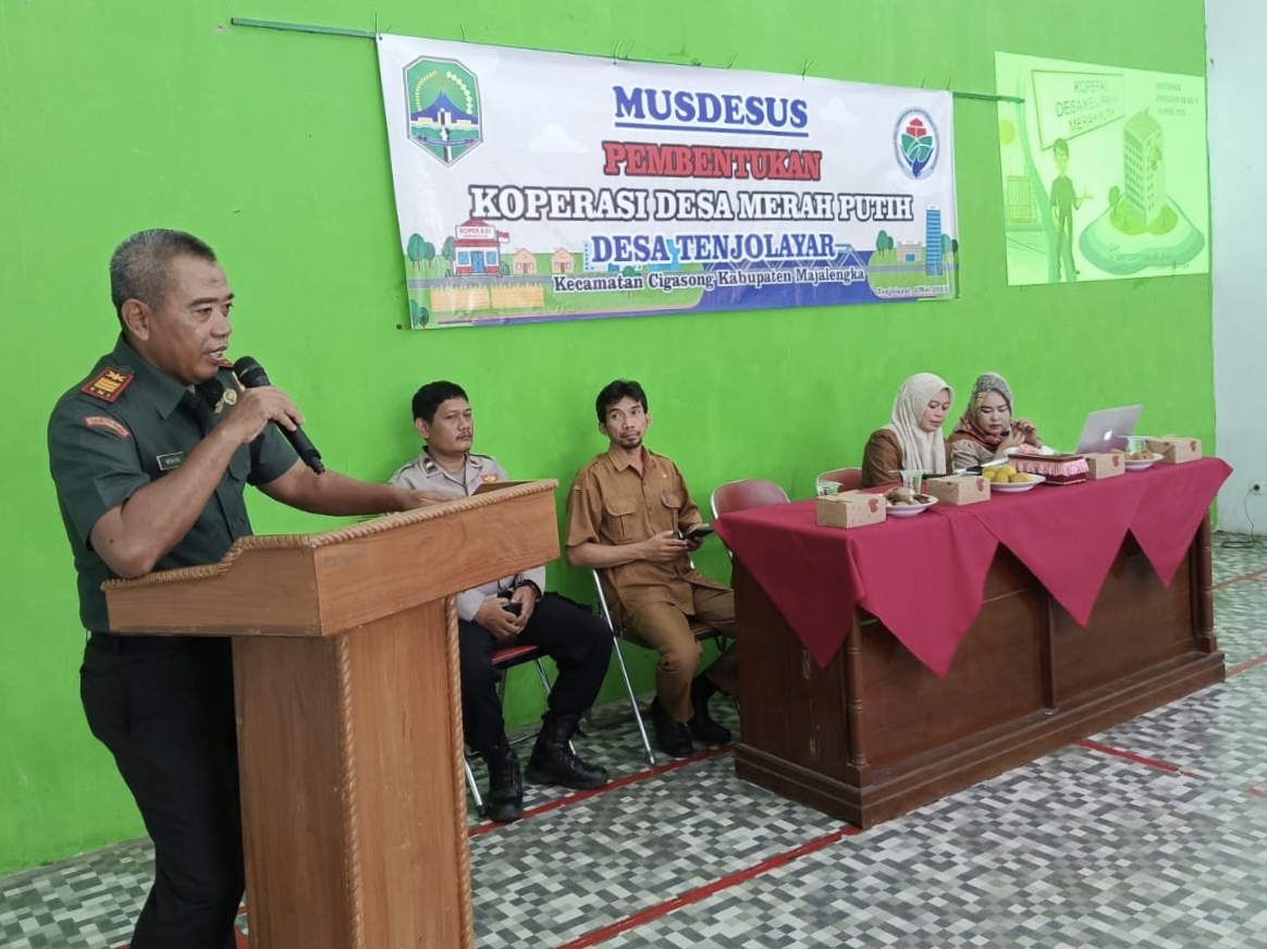 Majalengka – Danramil 1701/Majalengka Kapten Arh Winarno, menghadiri kegiatan Musyawarah Desa Khusus Pembentukan Koperasi Desa Merah Putih yang digelar di Aula Desa Tenjolayar, Kecamatan Cigasong, Kabupaten Majalengka, pada Senin (5/5/2025).