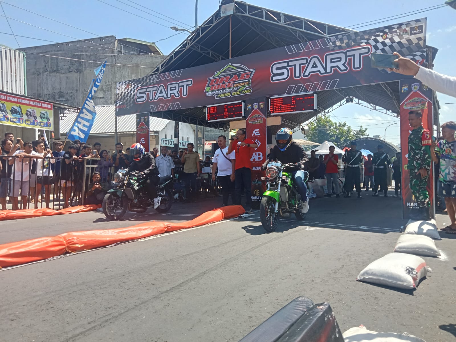 Suasana semakin semarak ketika dua motor modifikasi tampil pada sesi pembukaan. Motor tersebut digunakan secara simbolis oleh Wakil Bupati Ngawi bersama penyelenggara untuk melakukan start perdana. Desainnya yang menyerupai motor kontes semakin menegaskan nuansa hiburan dalam ajang drag bike kali ini.
