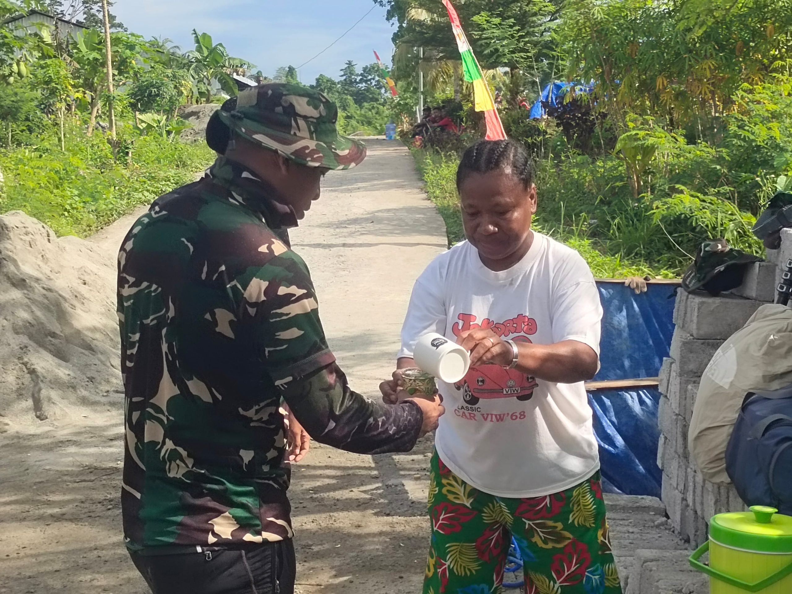 Aksi tersebut terlihat saat Mama Ruth Dolfina Maay bersama beberapa warga lainnya datang ke lokasi pembangunan sambil membawa berbagai hidangan sederhana. Mulai dari makanan ringan, roti, hingga minuman hangat seperti teh manis dan kopi, semuanya disiapkan untuk dinikmati oleh personel Satgas dan warga yang sedang bekerja.