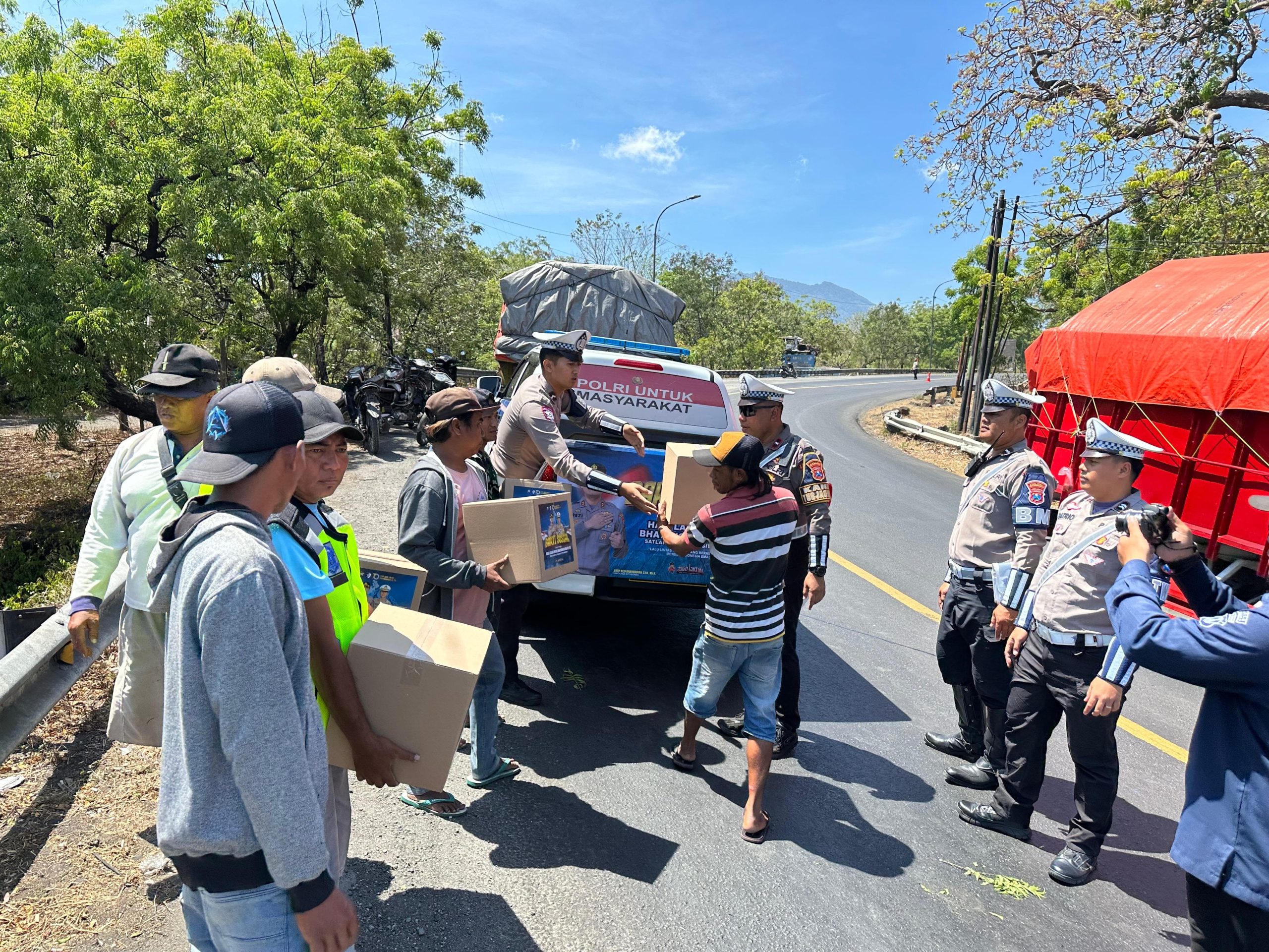 Selain berbagi sembako, Satlantas Polres Situbondo Polda Jatim juga menyampaikan imbauan tertib berlalu lintas dan pentingnya mematuhi aturan demi keselamatan bersama.