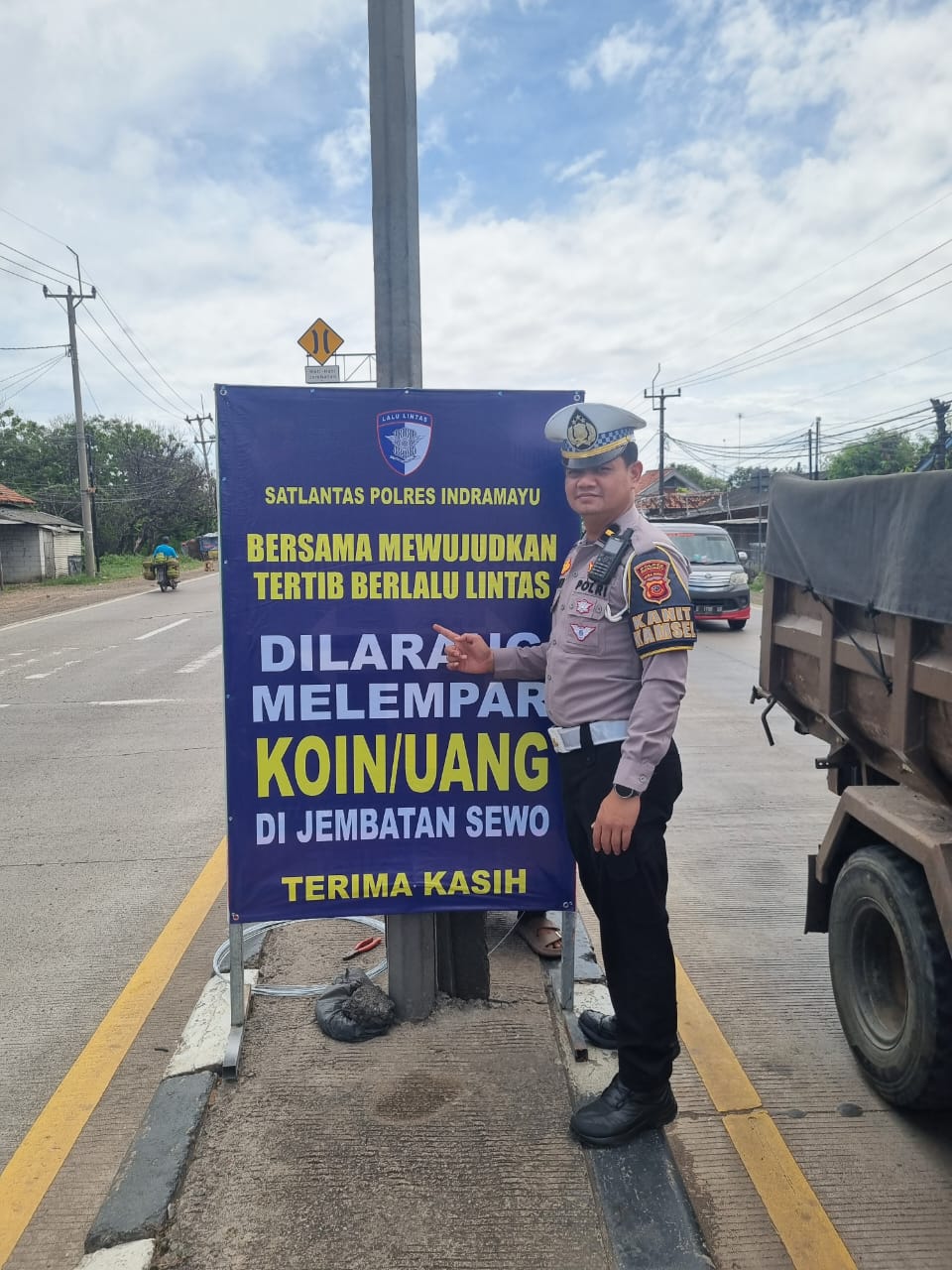 Kanit Kamsel Satlantas Polres Indramayu, IPDA Jeni Imanudin, S.H., memimpin pemasangan banner imbauan keselamatan yang berisi larangan membuang koin atau uang di area jembatan.