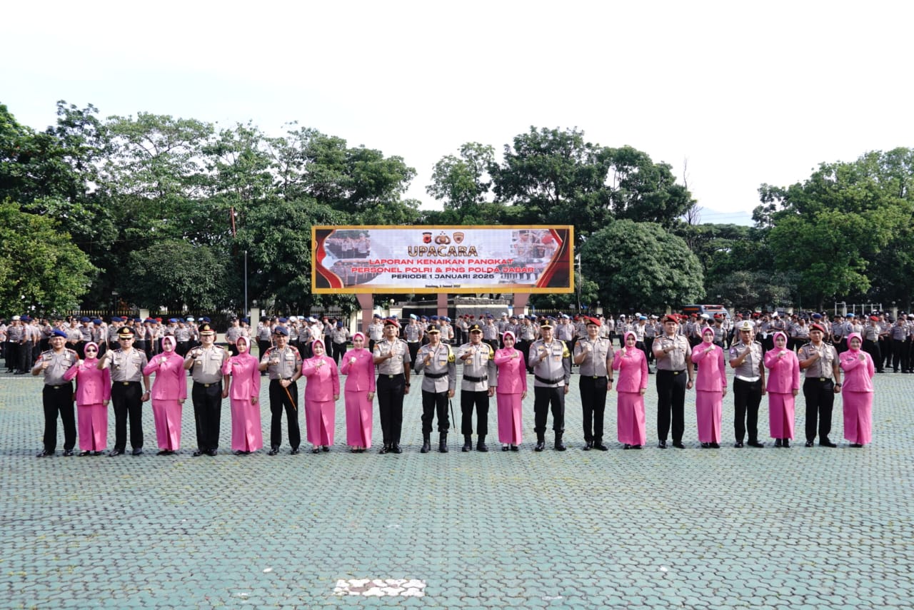 Kapolda Jawa Barat, Irjen Pol. Dr. Akhmad Wiyagus, S.I.K., M.Si., M.M., memimpin Upacara Kenaikan Pangkat Polri dan ASN Polda Jabar, turut hadir Wakapolda Jabar dan Pejabat Utama Polda Jabar pada upacara kenaikan pangkat periode 01 Januari 2025 tingkat Polda Jabar bertempat di Halaman apel Mapolda Jabar, Kamis (2/1/2025)