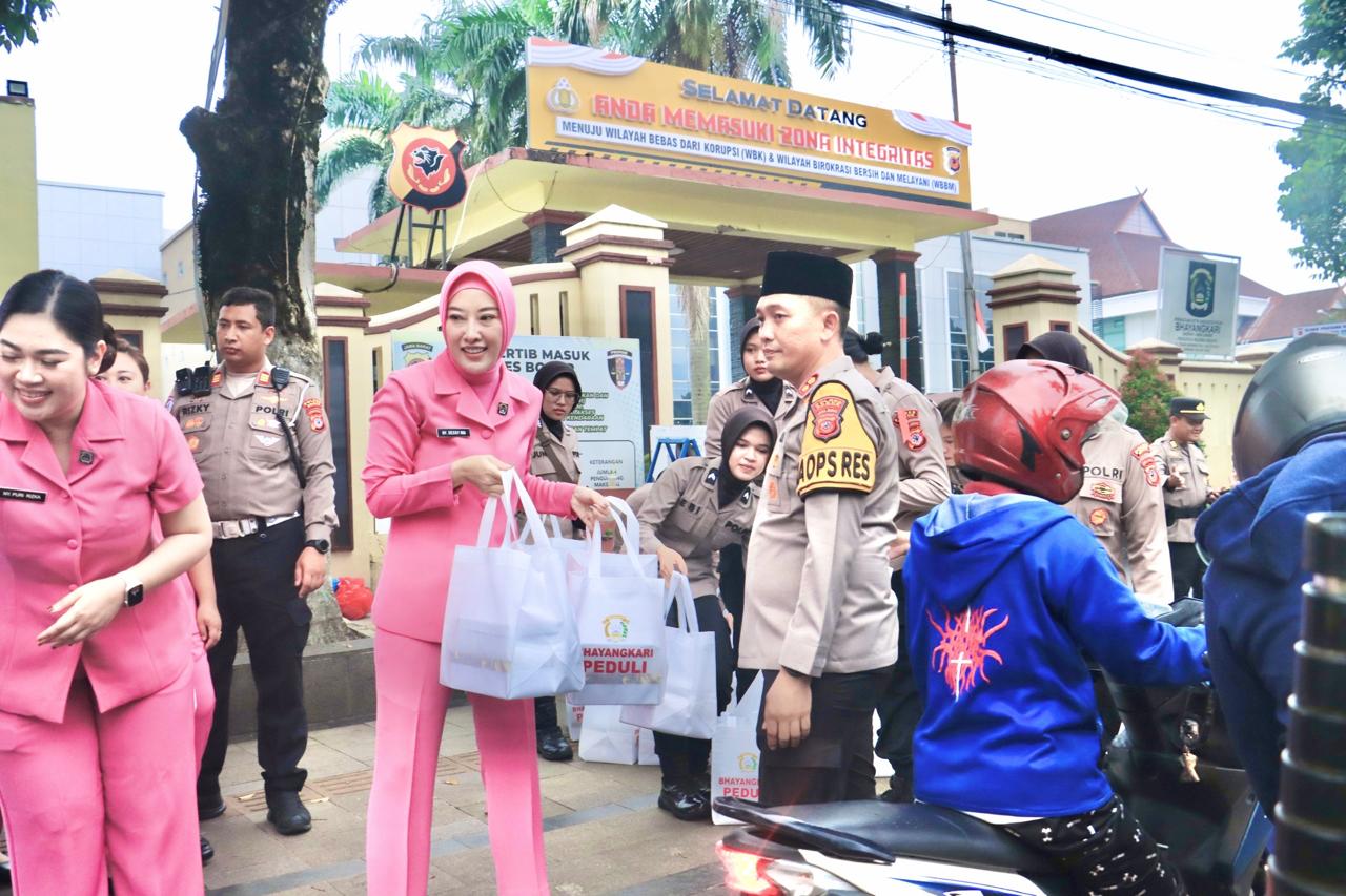 Kapolres Bogor AKBP Rio Wahyu Anggoro.,SH.,SIK.,MH didampingi Ketua Bhayangkari Cabang Polres Bogor Ny. Desi Rio, menyampaikan bahwa di Bulan Suci Ramadhan ini, mari kita sama sama merasakan kehidupan satu sama lain, bisa berbagi yangmana kita bisa berdiri di sepatu orang lain maka Kami ingin berbagi kebahagiaan dengan warga yang sedang menjalankan ibadah puasa.