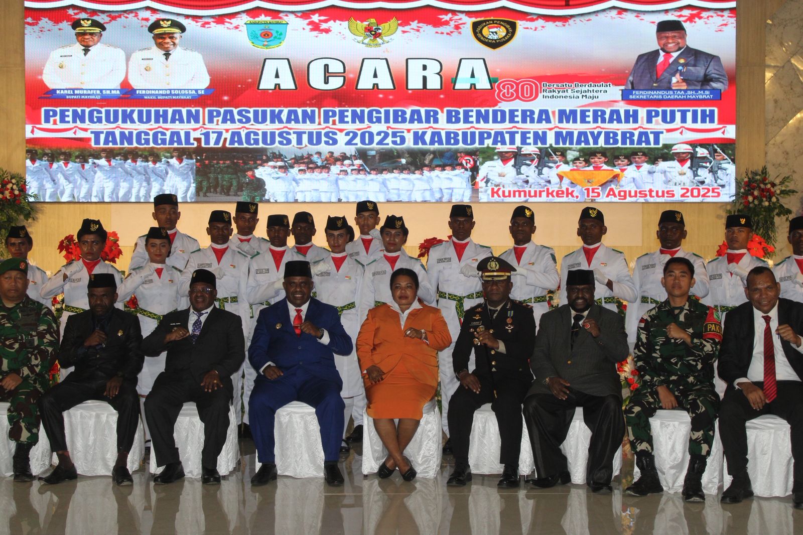 Pengukuhan ini dipimpin langsung oleh Bupati Maybrat, Karel Murafer, S.H., M.H., yang secara simbolis menyematkan tanda pengukuhan kepada perwakilan anggota Paskibraka. Momen ini menjadi salah satu agenda penting menjelang puncak peringatan HUT ke-80 Kemerdekaan Republik Indonesia pada 17 Agustus 2025 mendatang.