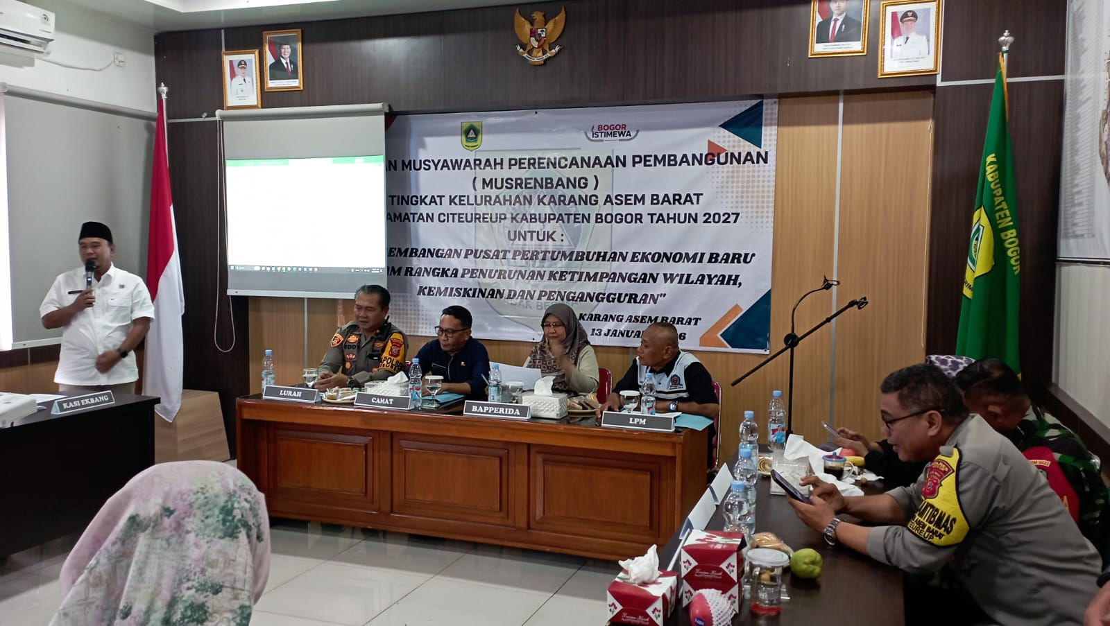 BOGOR – Kapolsek Citeureup Kompol Eddy Santosa, S.Pd,. M.H dan Anggota , pada hari ini Selasa tanggal 13 Januari 2026 sekira jam 10.00 Wib telah mengikuti Kegiatan Musrenbang Tingkat Kel Karang Asem barat dengan tema,pengembangan pusat pertumbuhan ekonomi baru dalam rangka penurunan ketimpangan wilayah kemiskinan dan Kapolsek Memberikan Himbauan Kamtibmas juga Sosialisasi Aduan Warga melalui Operator 110, adapun acara tersebut dihadiri :