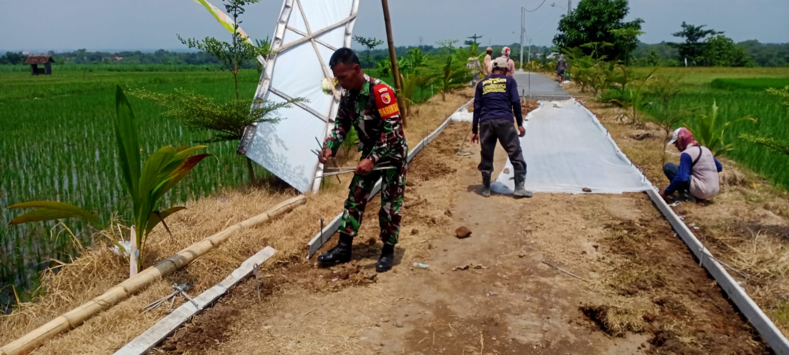 MADIUN, BUSERJATIM.COM GROUP – Serda Suwarno, Babinsa Desa Sukosari dari Koramil 0803-14 Dagangan, melaksanakan kegiatan kerja bakti pembuatan jalan di Dukuh Pogo RT.19 RW.06, Desa Sukosari, Kecamatan Dagangan, Kabupaten Madiun pada Senin (6/1). Kegiatan ini bertujuan untuk meningkatkan aksesibilitas masyarakat dan mendukung pengembangan infrastruktur desa.