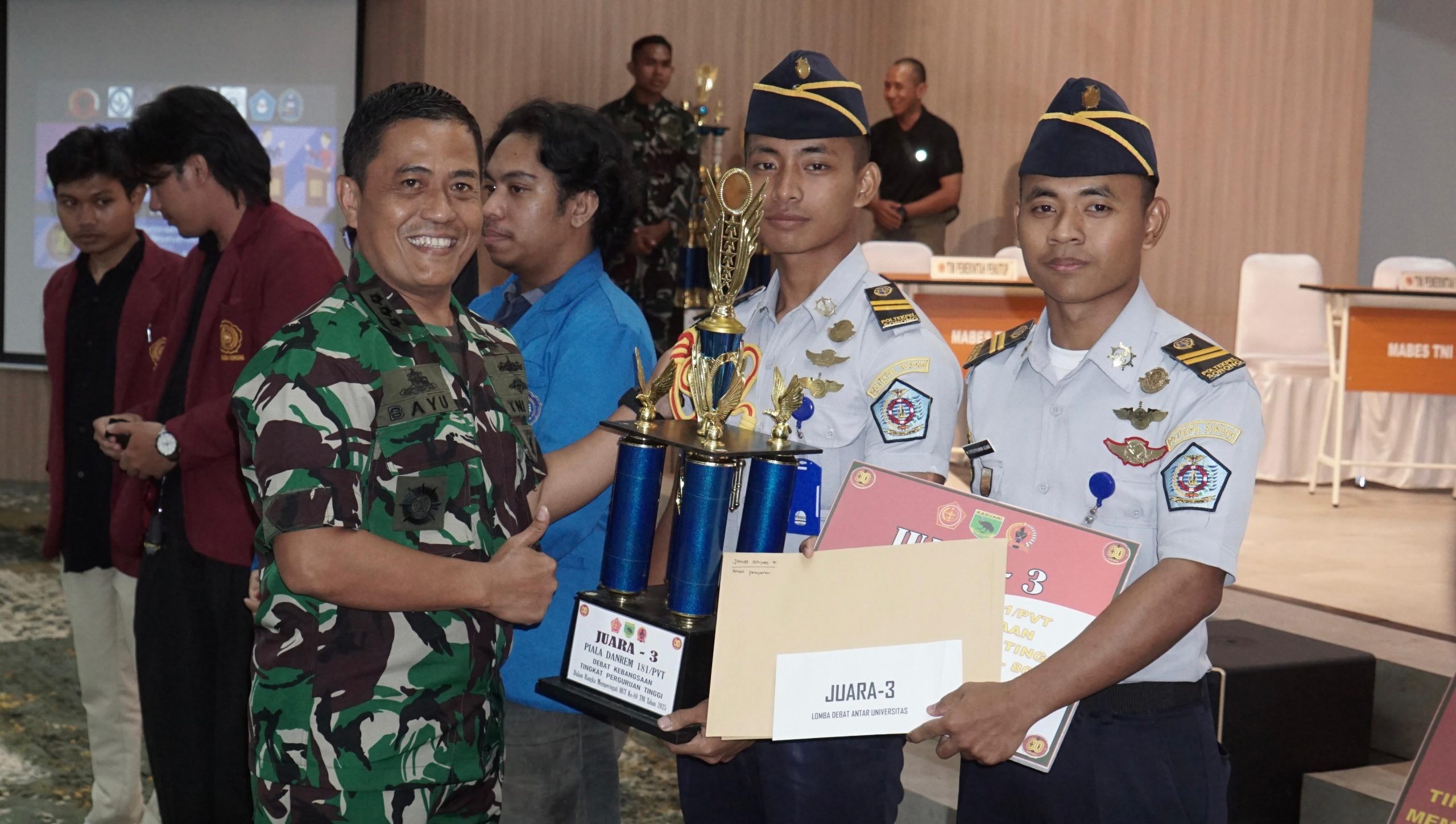 SORONG PBD, BUSERJATIM.COM GROUP – Panglima Komando Armada III, Laksamana Muda TNI Hudiarto Krisno Utomo, PSC(j)., M.A., M.M.S., CHRMP., diwakili oleh Aster Pangkoarmada III, Kolonel Laut (P) Bayu Dwi Wicaksono, S.T., M.Tr.Hanla., M.M. menghadiri Grand Final Debat Kebangsaan Tingkat Mahasiswa dalam rangka memperingati HUT ke-80 TNI, yang digelar oleh Komando Resor Militer (Korem) 181/Praja Vira Tama di Aula Bank Mandiri, Sorong, (27/9).