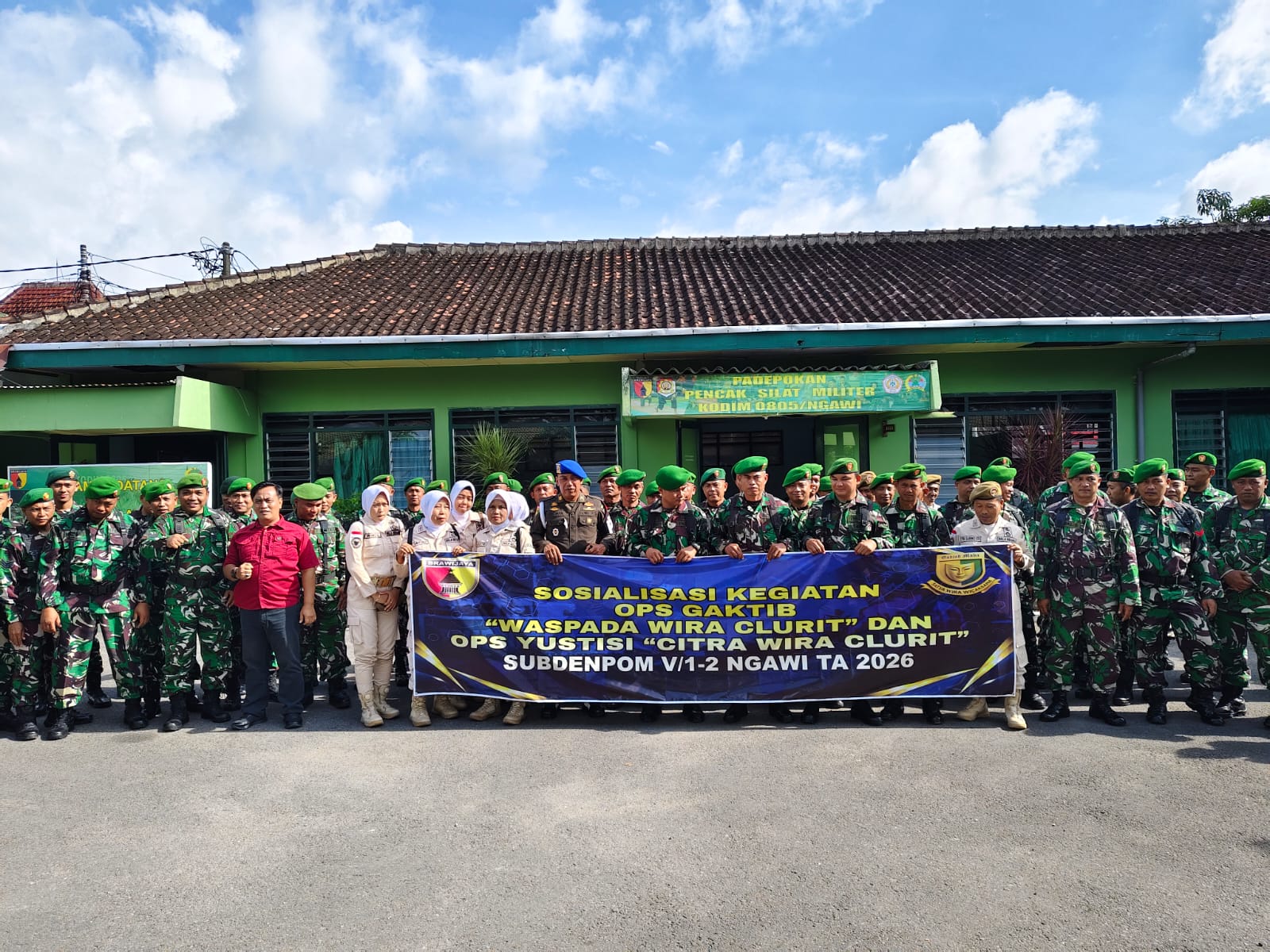 NGAWI, BUSERJATIM.COM GROUP – Dalam upaya meningkatkan disiplin dan kepatuhan hukum prajurit, Kodim 0805/Ngawi bersama Subdenpom Ngawi menyelenggarakan sosialisasi kegiatan Operasi Penegakan Ketertiban (Ops Gaktib) bertajuk “Waspada Wira Clurit” serta Operasi Yustisi. Kegiatan tersebut digelar di aula Makodim 0805/Ngawi dan diikuti oleh seluruh anggota militer maupun PNS di lingkungan Kodim serta anggota Subdenpom Ngawi. Rabu (18/2/2026).