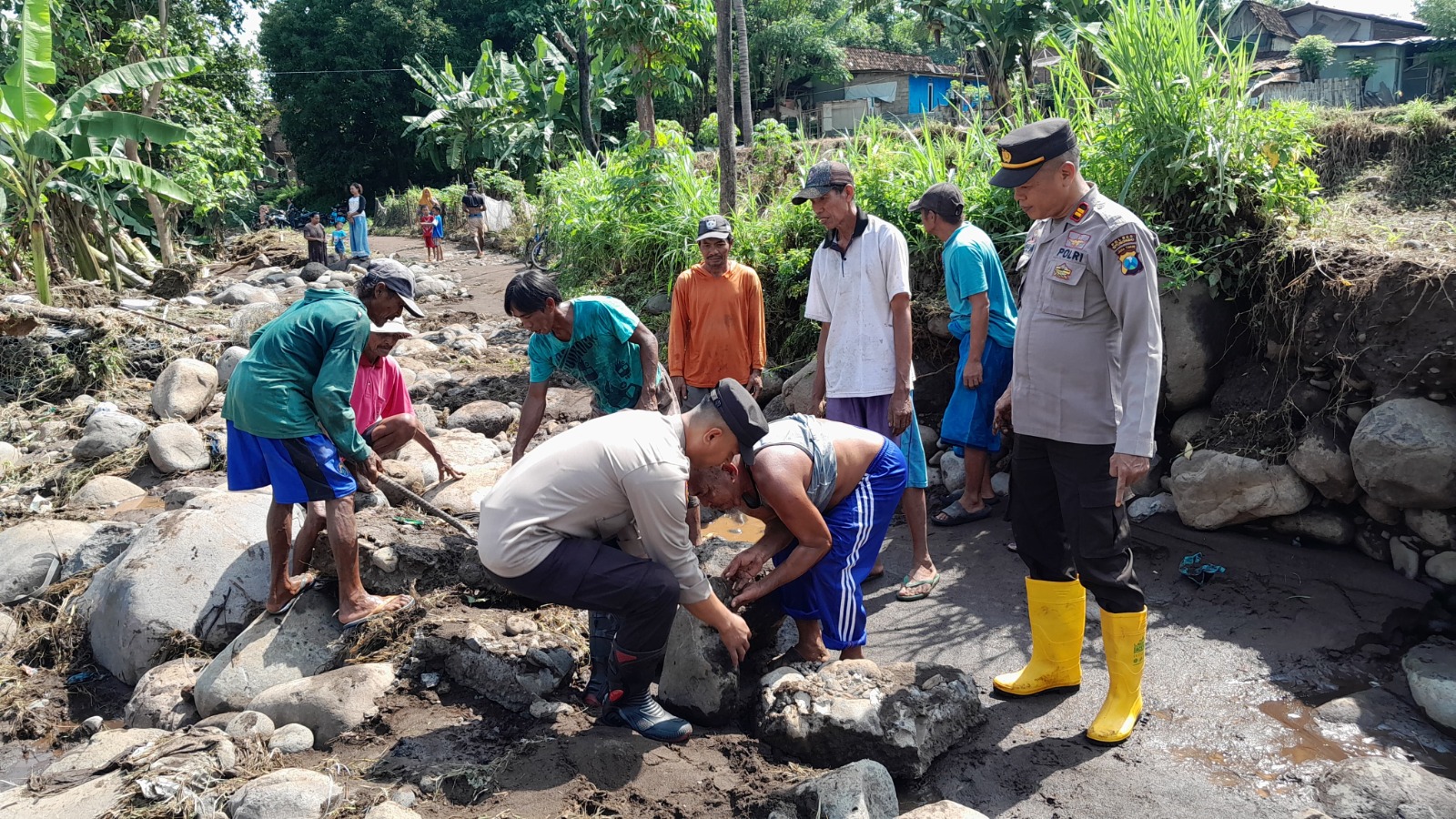 SITUBONDO , BUSERJATIM.COM GROUP – Personel Polsek Jatibanteng Polres Situbondo bersama masyarakat melaksanakan kerja bakti membersihkan kayu dan material sisa banjir serta memasang bronjong di Jembatan Dusun Dauh Desa Jatibanteng.