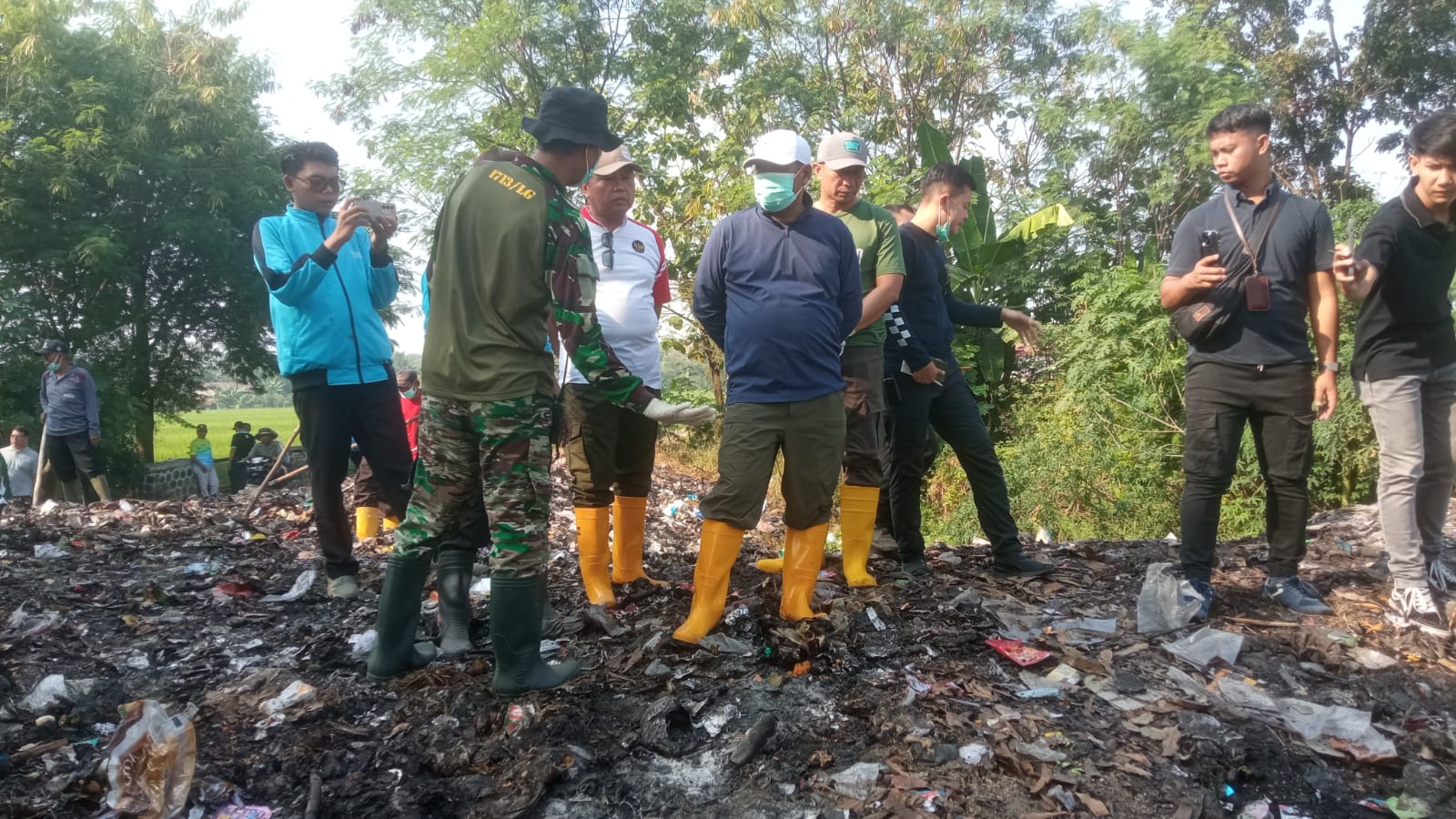 1. Pembersihan sampah di sepanjang jalur aliran Sungai Sindukpraja, Desa Wanasalam.