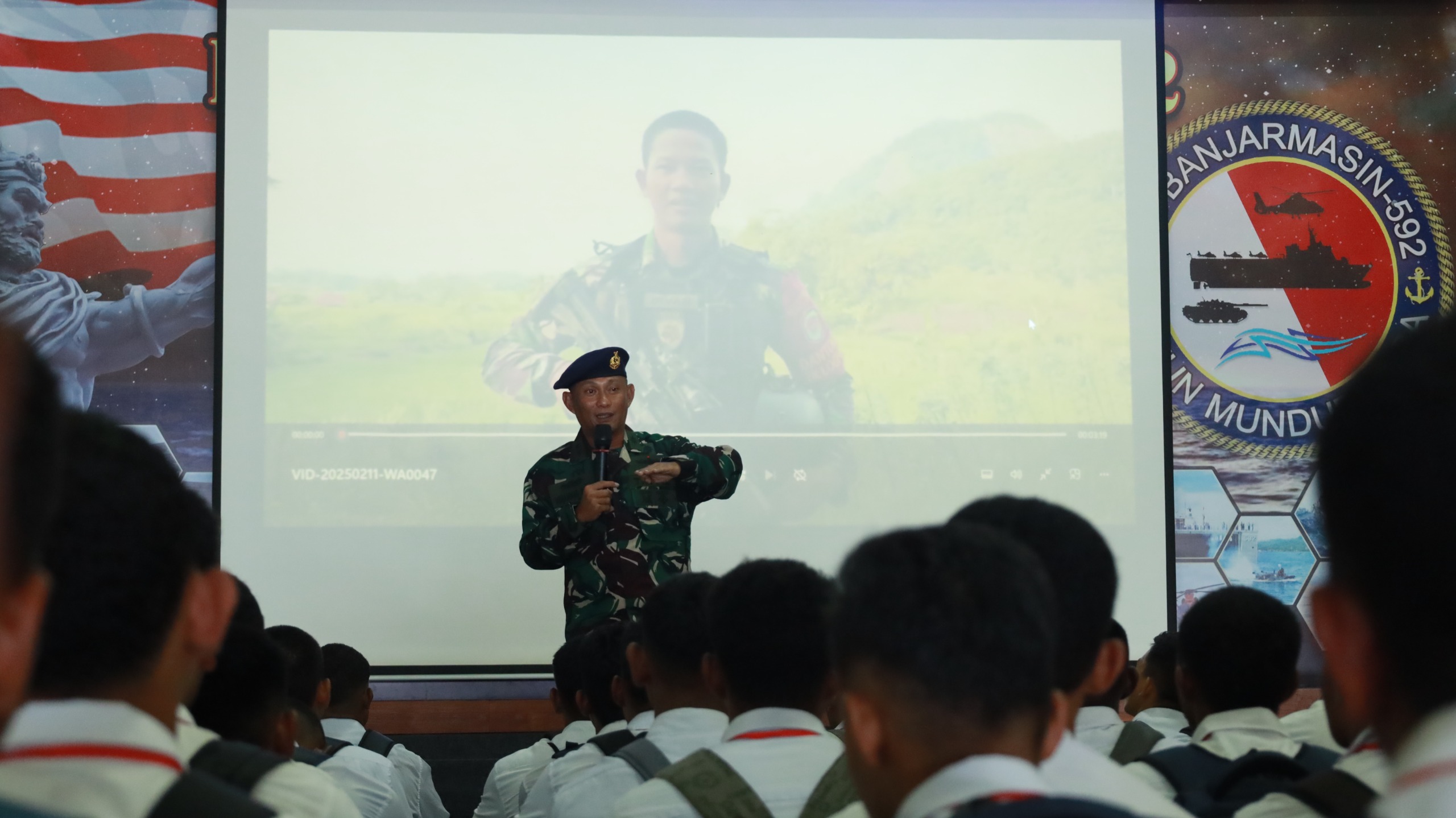 KOTA SORONG, BUSERJATIM.COM GROUP – Asisten Personal (Aspers) Komandan Pangkalan Utama TNI AL (Danlantamal) XIV Sorong, Letkol Laut (P) Muhammad Ilham Agus, mewakili Danlantamal XIV saat memberikan wawasan dan motivasi kepada calon siswa Tamtama PK TNI AL Panda Sorong. Kegiatan ini berlangsung di Kapal Perang Republik Indonesia (KRI) Banjarmasin-592, yang sedang bersandar di Dermaga Mako Lantamal XIV Sorong, Jl. Bubara No.1, Klaligi, Distrik Sorong, Kota Sorong, Papua Barat Daya. Selasa (11/02/25)