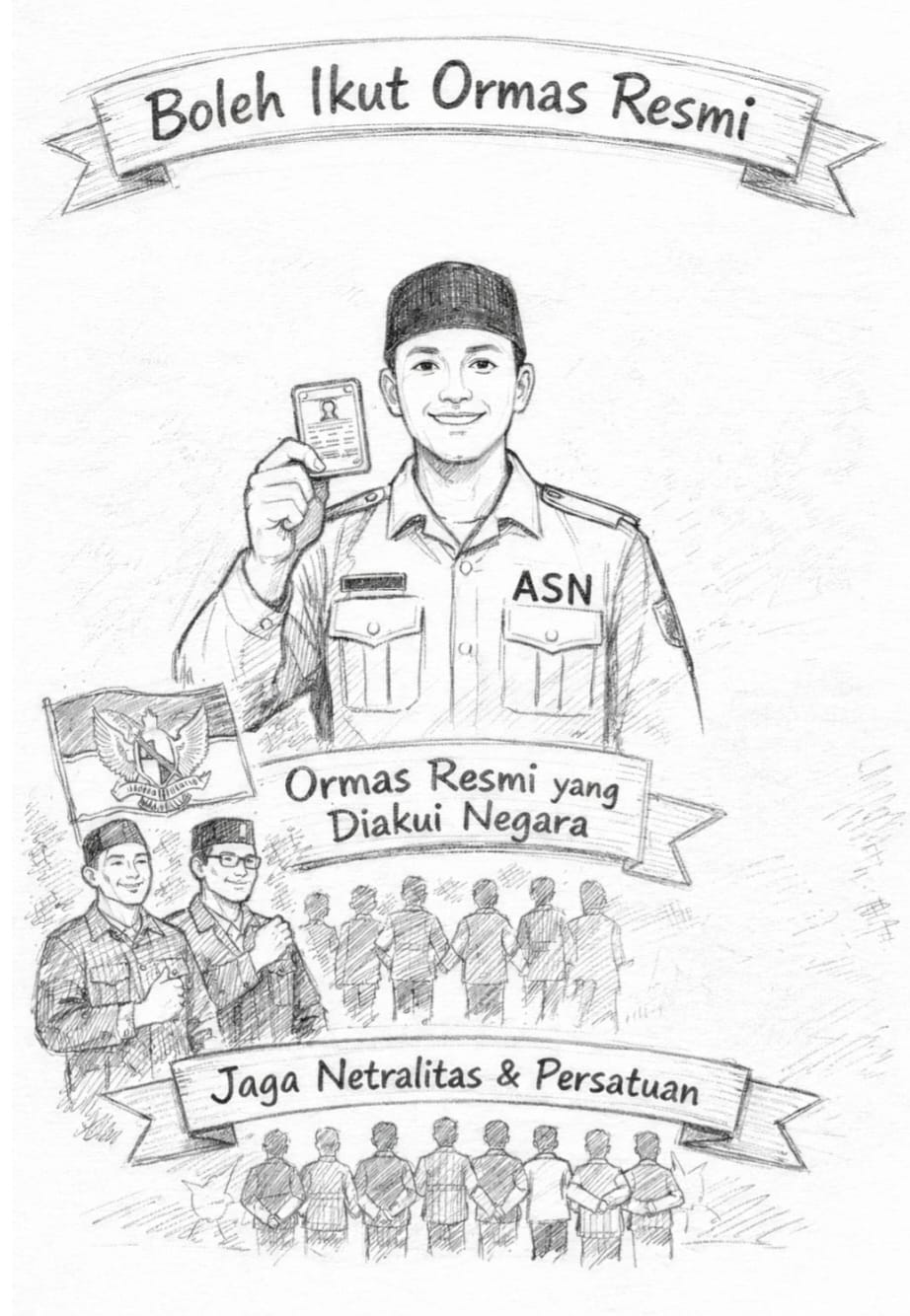 Secara umum, keikutsertaan ASN dalam organisasi kemasyarakatan diperbolehkan oleh peraturan perundang-undangan, dengan catatan organisasi tersebut sah dan tidak bertentangan dengan nilai-nilai Pancasila serta Negara Kesatuan Republik Indonesia (NKRI).