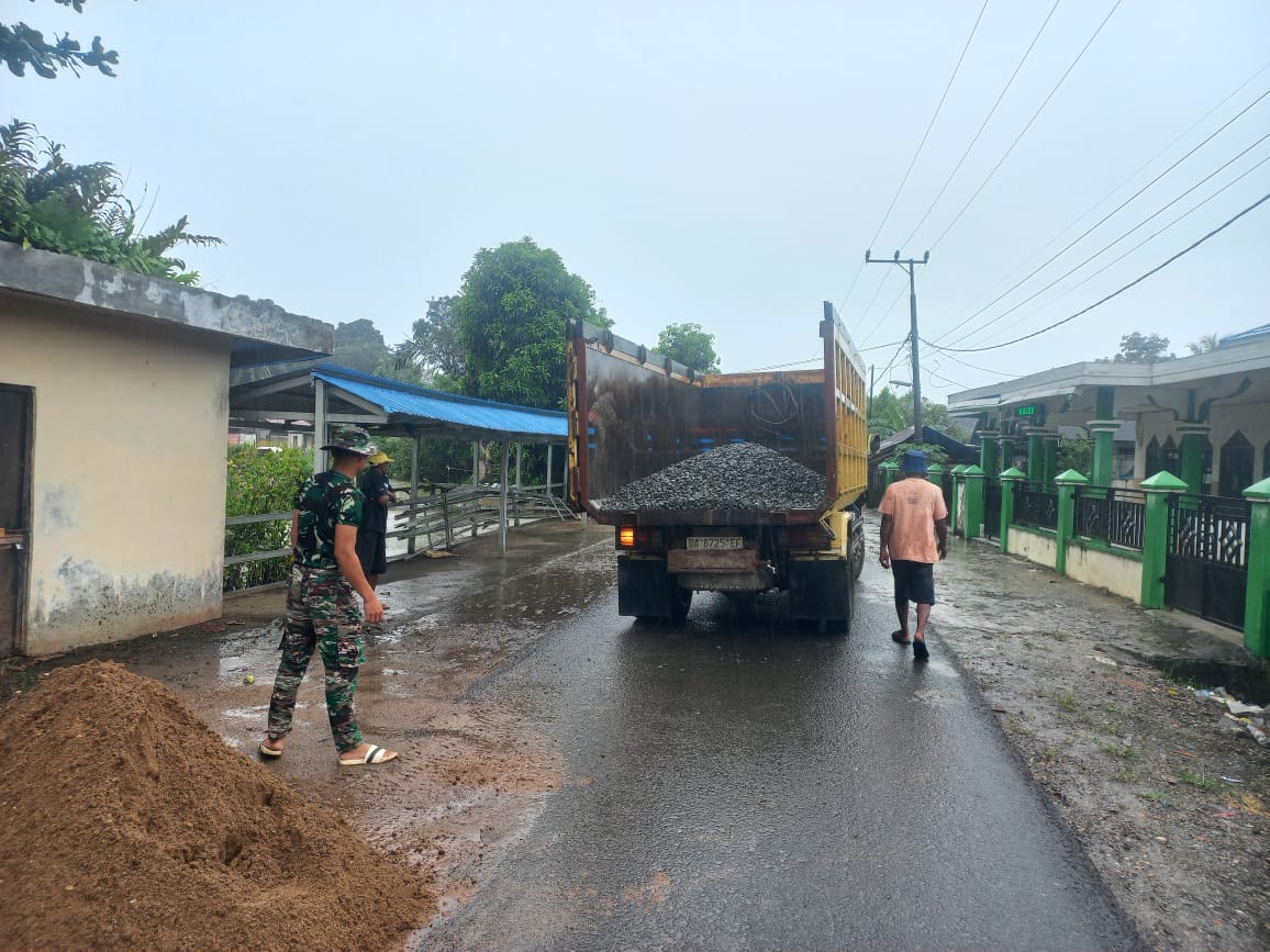 Di lapangan, terlihat anggota TNI bersama masyarakat bahu-membahu melakukan berbagai pekerjaan, mulai dari penataan material hingga persiapan konstruksi lanjutan.