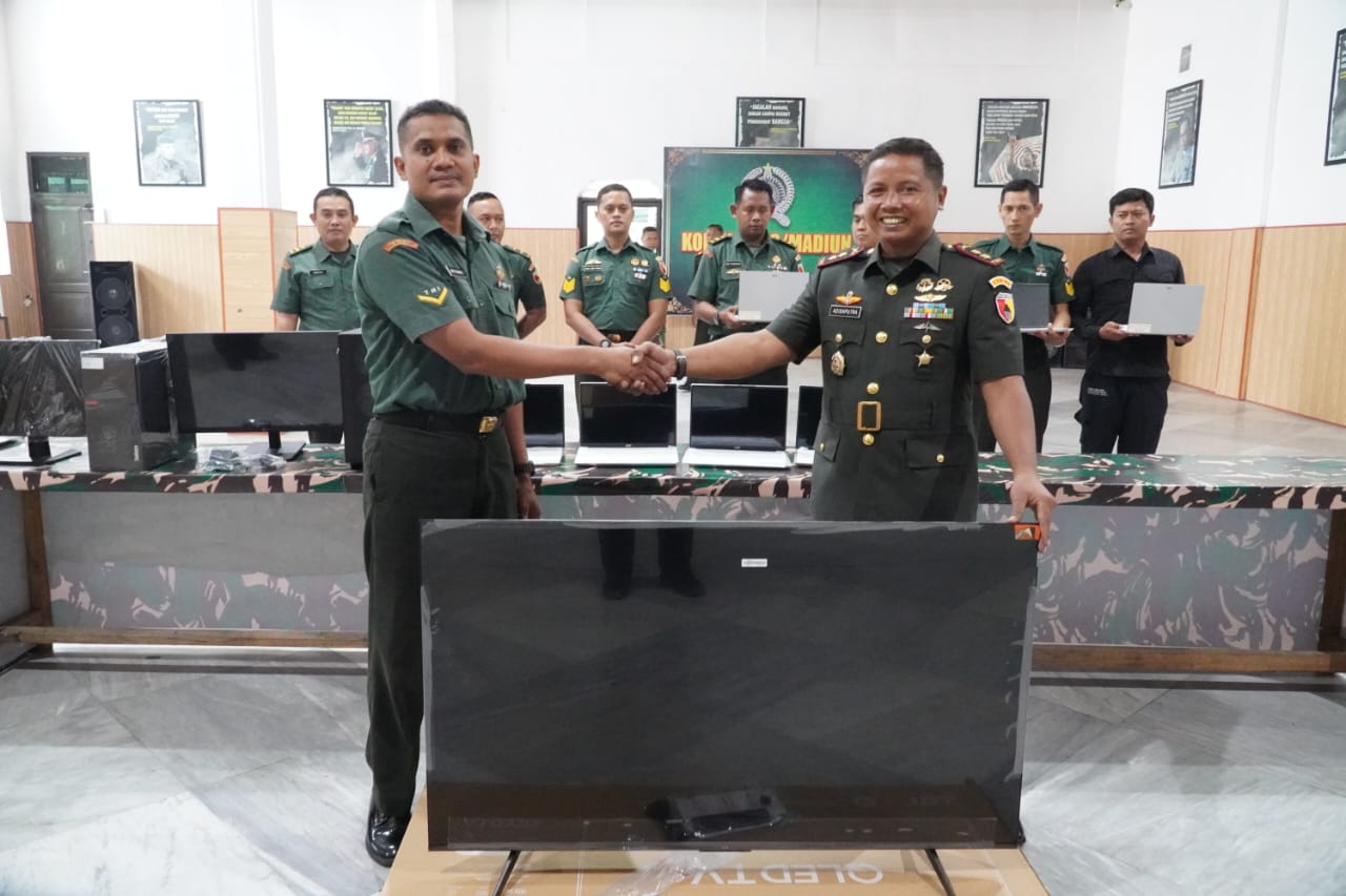 MADIUN, BUSERJATIM.COM GROUP – Komandan Kodim (Dandim) 0803/Madiun, Letkol Inf I Nyoman Adhisaputra, menyerahkan bantuan sarana pendukung berupa delapan unit laptop, empat unit komputer (PC), satu unit kamera DSLR, dan satu unit televisi berukuran 55 inci kepada staf jajaran Kodim 0803/Madiun, Selasa (tanggal menyesuaikan).