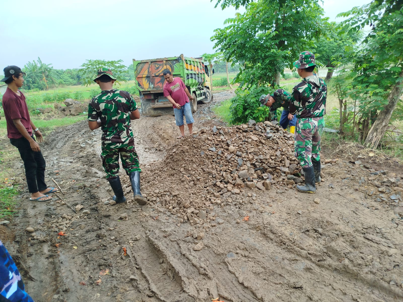 Pagi ini, puluhan kubik batu split tiba di lokasi proyek. Satgas TMMD bersama warga segera bergotong royong untuk mendistribusikan material ke titik-titik pengerjaan. Meskipun cuaca panas dan medan yang cukup berat, semangat para prajurit dan warga tidak surut demi menyelesaikan pekerjaan sesuai target.