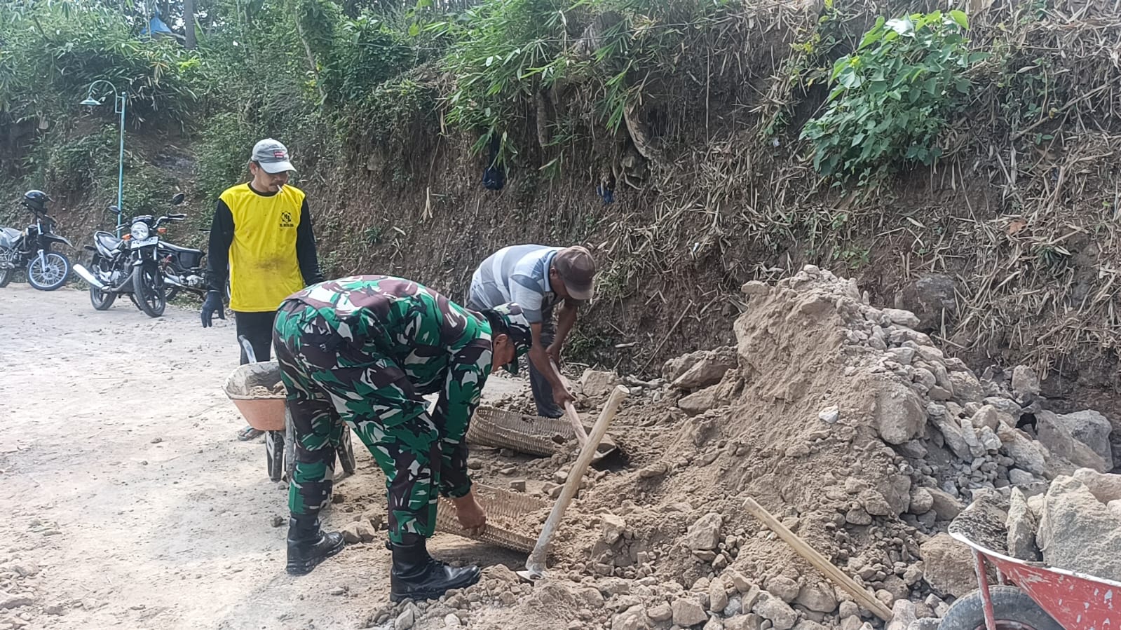 NGAWI, BUSERJATIM.COM GROUP – Babinsa Koramil 0805/07 Ngrambe Kodim Ngawi Serka Sumardi bersama warga masyarakat melaksanakan kegiatan karya bakti perbaikan jalan di Dusun Baan Desa Manisharjo Kecamatan Ngrambe, Rabu (03/09/2025)