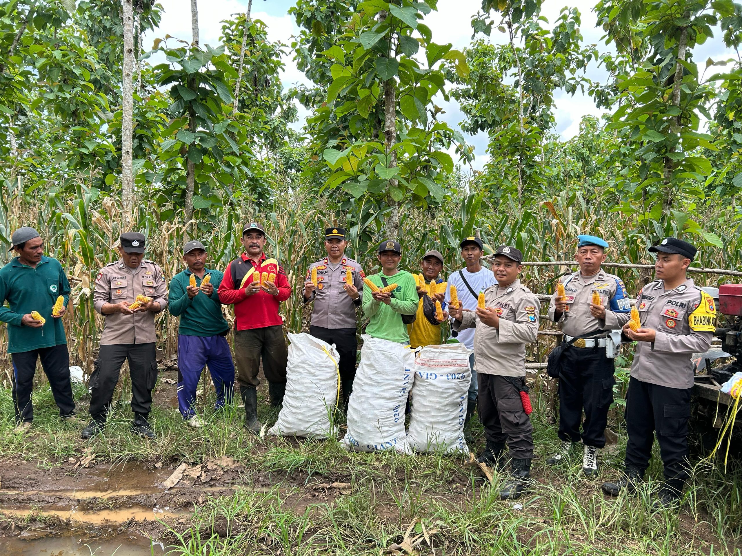 Kapolsek Tegaldlimo, IPTU Sadimun, S.H., beserta jajaran hadir langsung dalam kegiatan panen tersebut bersama Mantri Perhutani, Ketua KTH Purwo Maju Sejahtera, serta para anggota kelompok tani.