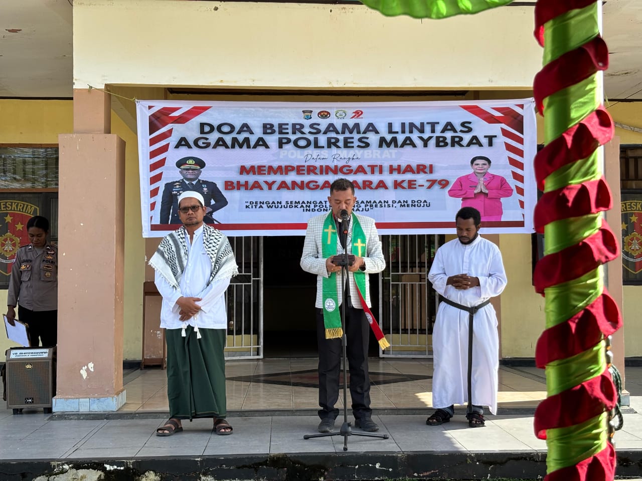 MAYBRAT, BUSERJATIM.COM GROUP, 20 Juni 2025 — Dalam rangka memperingati Hari Bhayangkara ke-79, Kepolisian Resor Maybrat menyelenggarakan kegiatan Doa Bersama Lintas Agama yang bertempat di Markas Komando (Mako) Polres Maybrat. Kegiatan ini merupakan wujud rasa syukur serta upaya mempererat persatuan dan kerukunan antarumat beragama di wilayah Kabupaten Maybrat.
