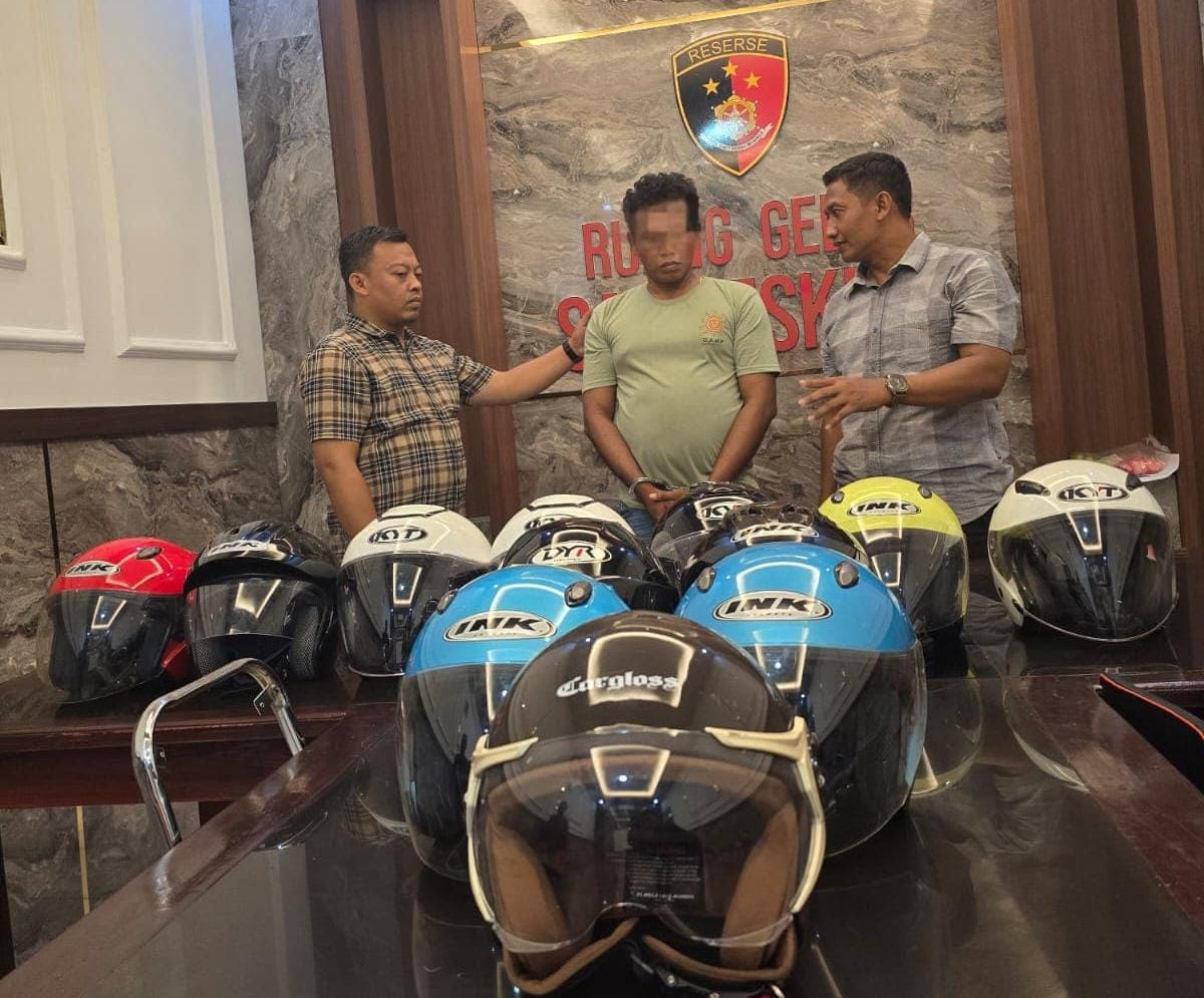 Pelaku berhasil diamankan berikut 12 buah helm sebagai barang bukti hasil kejahatan.