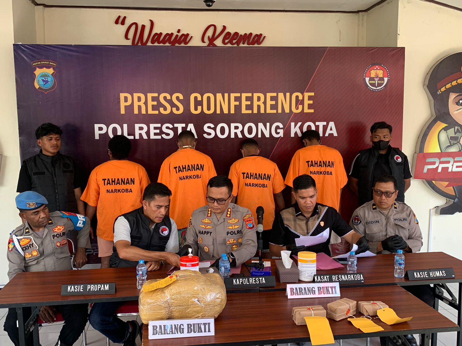 KOTA SORONG PBD, BUSERJATIM.COM GROUP — Kepolisian Resor Kota Sorong (Polresta Sorong Kota) menggelar konferensi pers penting pada Jumat (4/7/2025) terkait pengungkapan kasus peredaran narkotika jenis ganja di wilayah hukum Kota Sorong. Konferensi pers ini dipimpin langsung oleh Kapolresta Sorong Kota, Kombes Pol Happy Perdana Yudianto, S.IK, M.H, didampingi Kasat Narkoba, Kasie Propam, dan Kasie Humas Polresta Sorong.