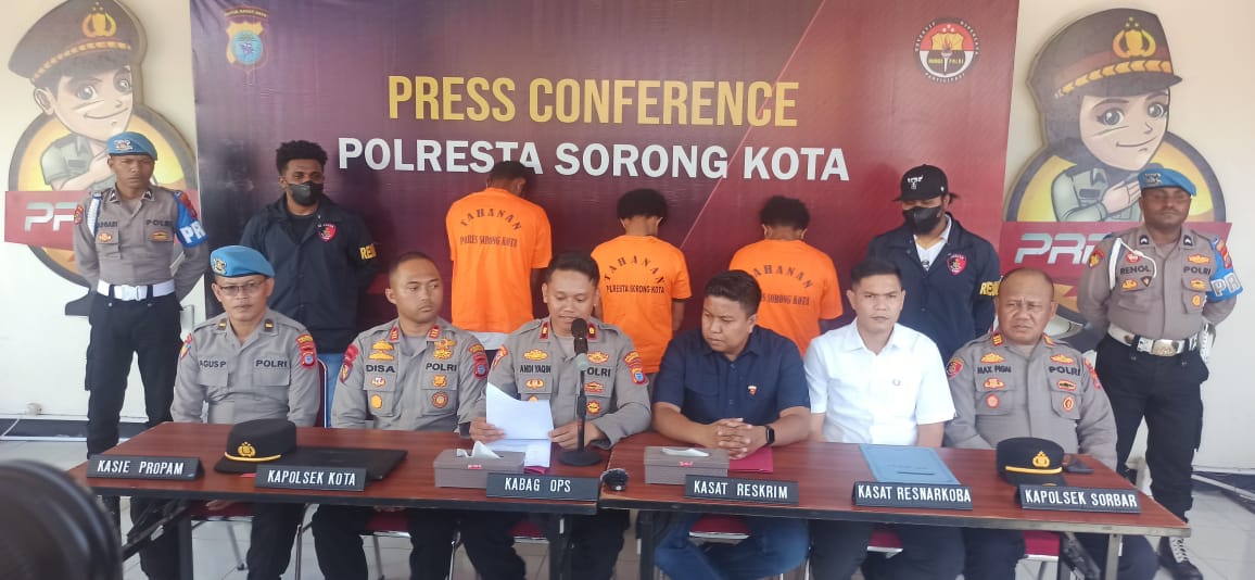 Konferensi pers ini dipimpin oleh Kabag Ops Polresta Sorong Kota, Kompol H. Muhamad Andi Nurul Yaqin, S.IK, mewakili Kapolresta Sorong Kota Kombes Pol Amry Siahaan, S.IK, MH, dan didampingi oleh Kasat Reskrim AKP Afrianga U. Tan, S.Tr.K, S.IK serta Kasat Narkoba AKP Rachmat Djakarta, S.IK, S.Tr.K, M.Si.