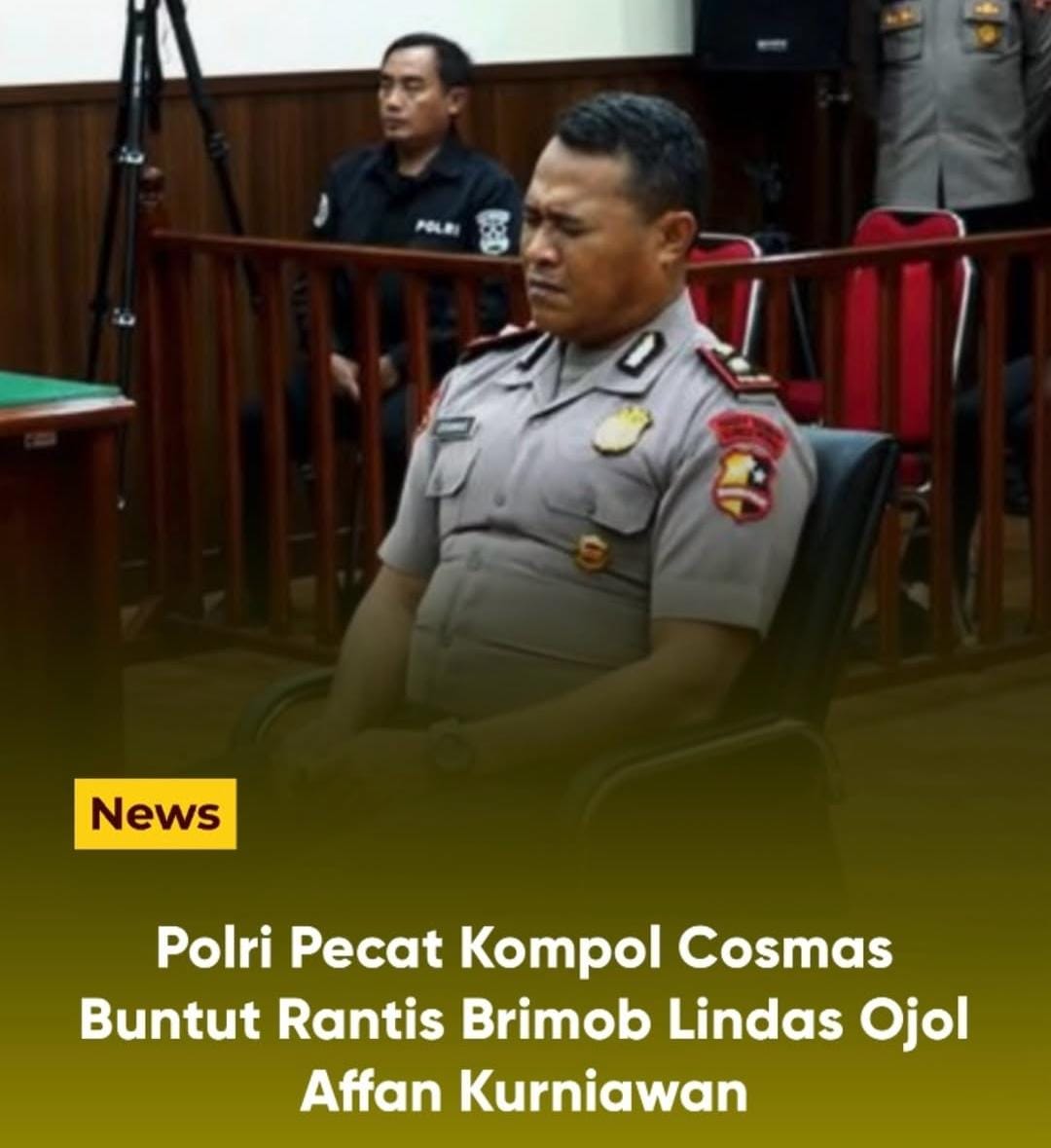 Jakarta | – Sidang Komisi Kode Etik Polri (KKEP) Komandan Batalyon (Danyon) Resimen IV Korps Brimob (Korbrimob) Polri, Kompol Kosmas K Gae, selesai dilakukan. Kompol Kosmas dipecat dari Polri buntut kasus tewasnya pengemudi ojek online (ojol), Affan Kurniawan, akibat dilindas kendaraan taktis (rantis) Brimob.