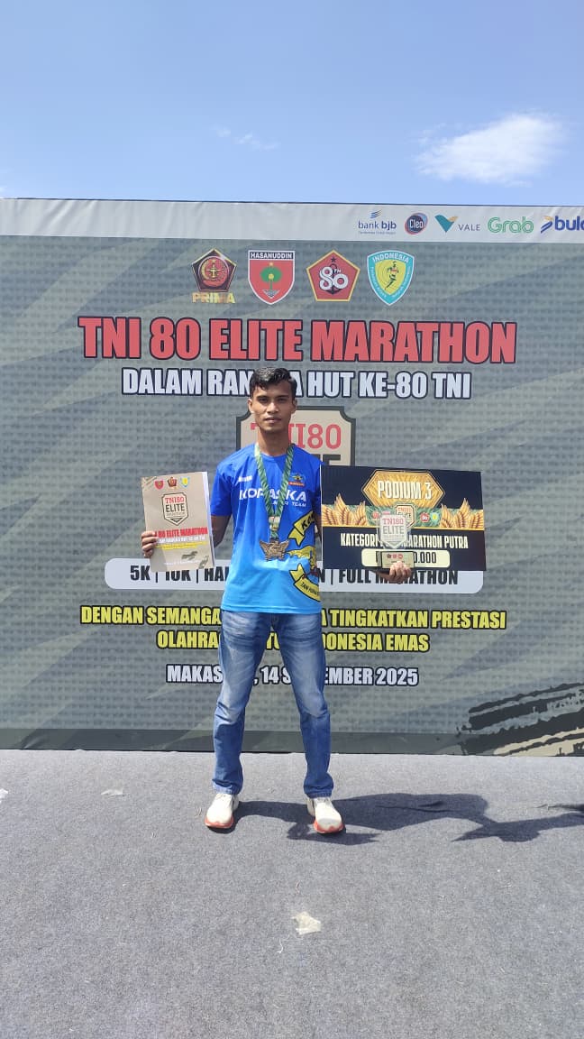 MAKASSAR, BUSERJATI.COM GROUP (15 September 2025) — Prajurit Satkopaska Koarmada III, Klk Brian Yakob, berhasil meraih Juara III pada kejuaraan olahraga Marathon Elite dalam rangka HUT Ke-80 TNI dengan jarak tempuh 42 kilometer di Makassar, (14/9).