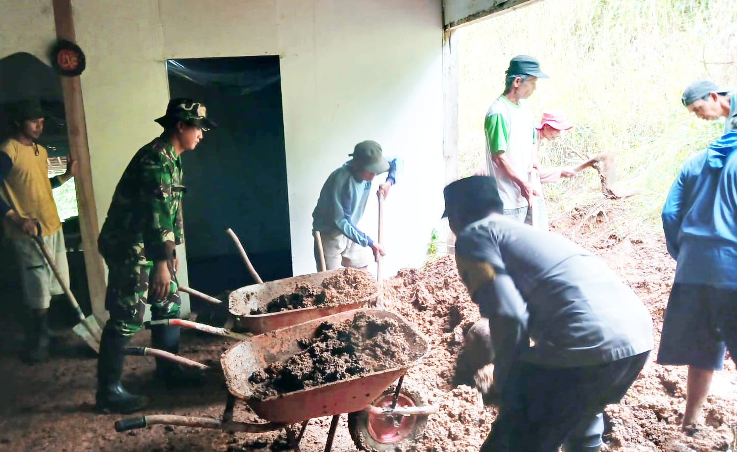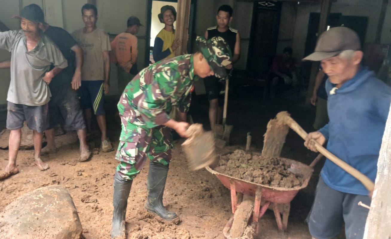 Sebagai langkah cepat penanganan untuk membantu warga terdampak, belasan Prajurit TNI dari Koramil 0803/06 Gemarang diterjunkan untuk membersihkan material timbunan longsor.