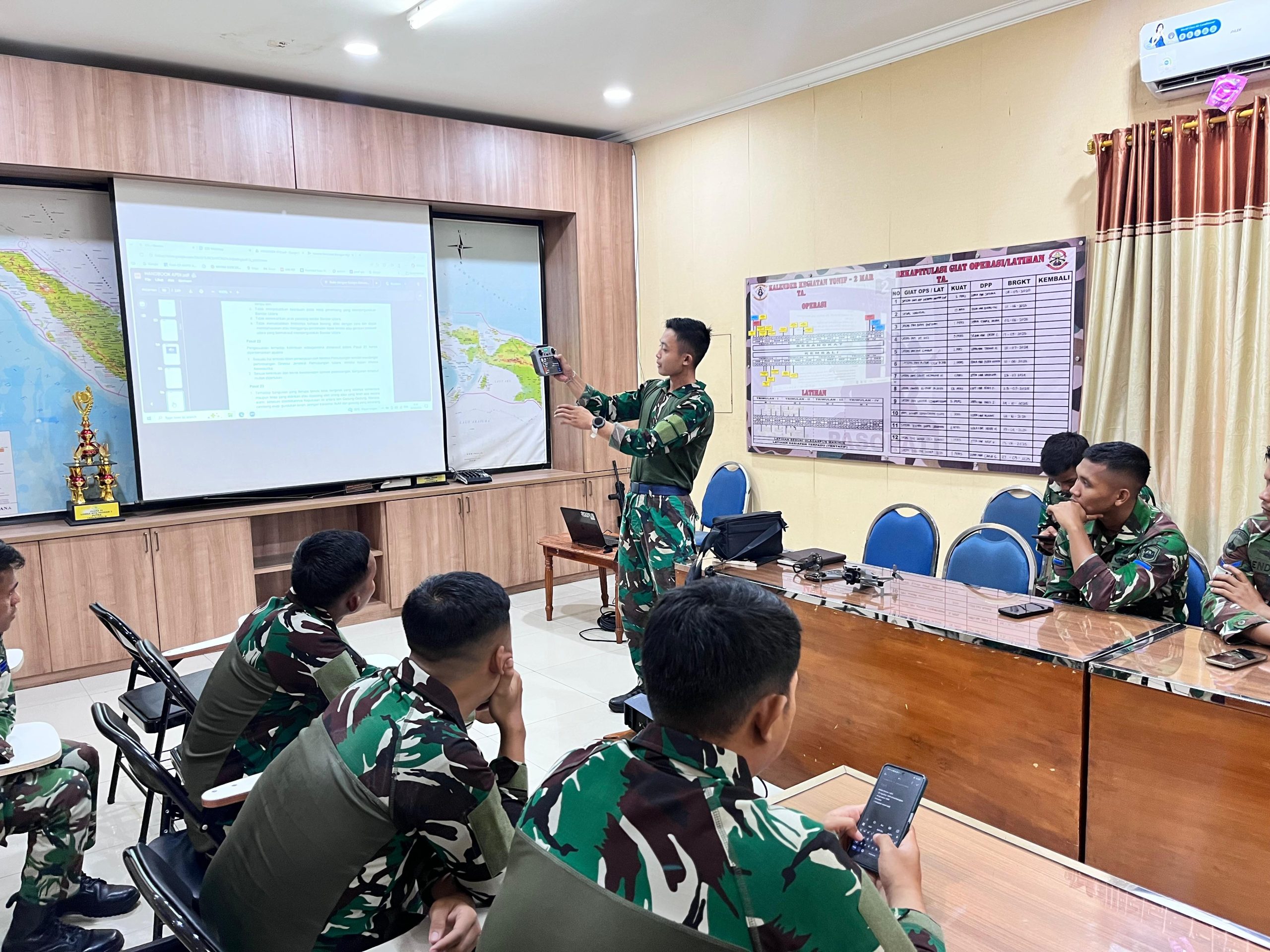 Materi pengenalan drone meliputi pengetahuan dasar tentang jenis-jenis drone, fungsi dan kegunaannya dalam operasi militer, serta pengenalan sistem pengoperasian dan pemanfaatannya untuk kepentingan pengintaian, pemantauan wilayah, dan dukungan tugas tempur di medan operasi. Para prajurit tampak antusias mengikuti setiap penjelasan yang disampaikan oleh pemateri.