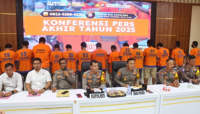 Probolinggo – Polres Probolinggo Kota membeberkan capaian kinerja sepanjang tahun 2025 dalam konferensi pers akhir tahun yang digelar di Mapolres Probolinggo Kota, Senin (29/12/25) siang. Sepanjang 2025, Polres mencatat sejumlah tren positif di bidang keamanan dan ketertiban masyarakat, mulai dari penurunan kasus narkotika, penurunan kecelakaan lalu lintas, hingga keberhasilan pengungkapan berbagai kasus kriminal yang menyita perhatian publik.