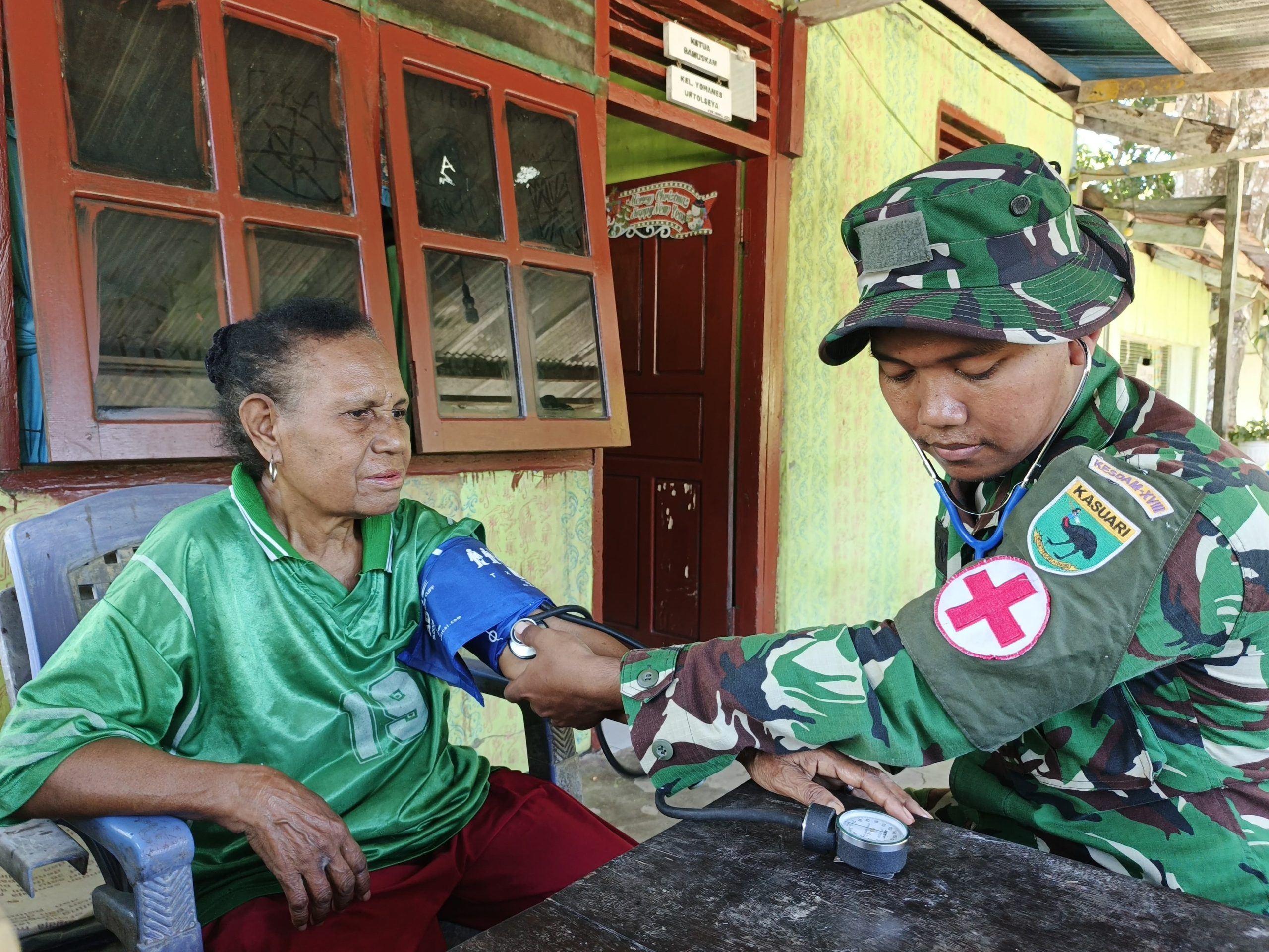 Petugas Kesehatan Satgas TMMD ke-128 Kodim 1801/Manokwari, Serda Prasetyo, menyampaikan bahwa pelayanan kesehatan dilakukan secara langsung di posko TMMD serta melalui kunjungan ke rumah warga yang membutuhkan penanganan medis.