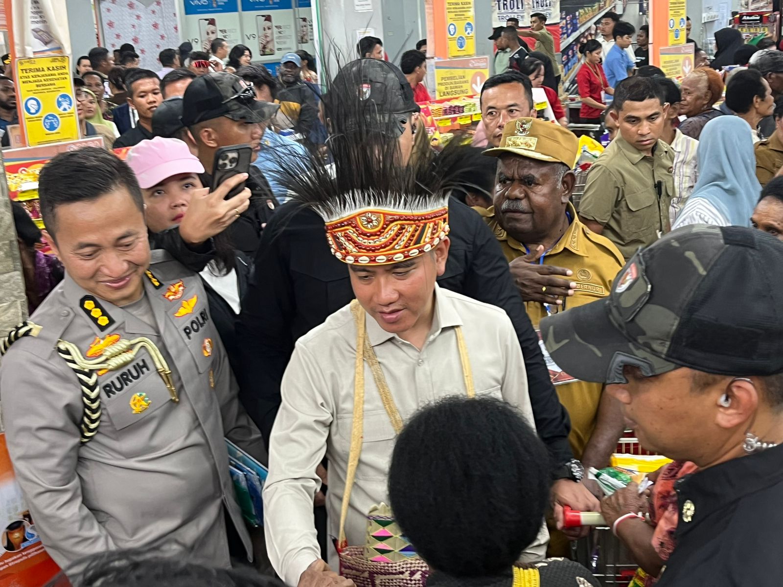 Tidak sekadar melakukan peninjauan formal, Gibran menunjukkan pendekatan yang lebih membumi. Ia berjalan menyusuri lorong-lorong supermarket, berhenti di beberapa titik, dan berbincang santai dengan para pengunjung, khususnya mama-mama Papua yang tengah berbelanja. Percakapan berlangsung hangat dan spontan, membahas berbagai hal mulai dari harga bahan pokok hingga tantangan ekonomi yang dirasakan dalam kehidupan sehari-hari.