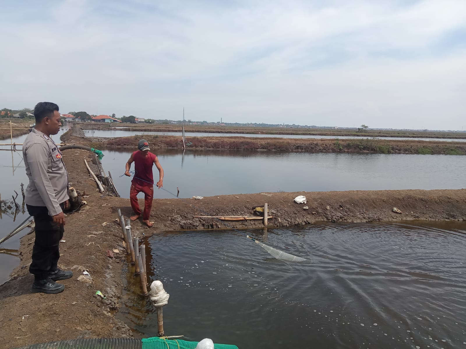 Bhabinkamtibmas Polsek Pasekan, Bripka Rudy Salam, melaksanakan monitoring terhadap aktivitas pembudidaya dan pembesaran udang vaname serta ikan bandeng di Blok V, Desa Karanganyar, Kecamatan Pasekan, Kabupaten Indramayu.